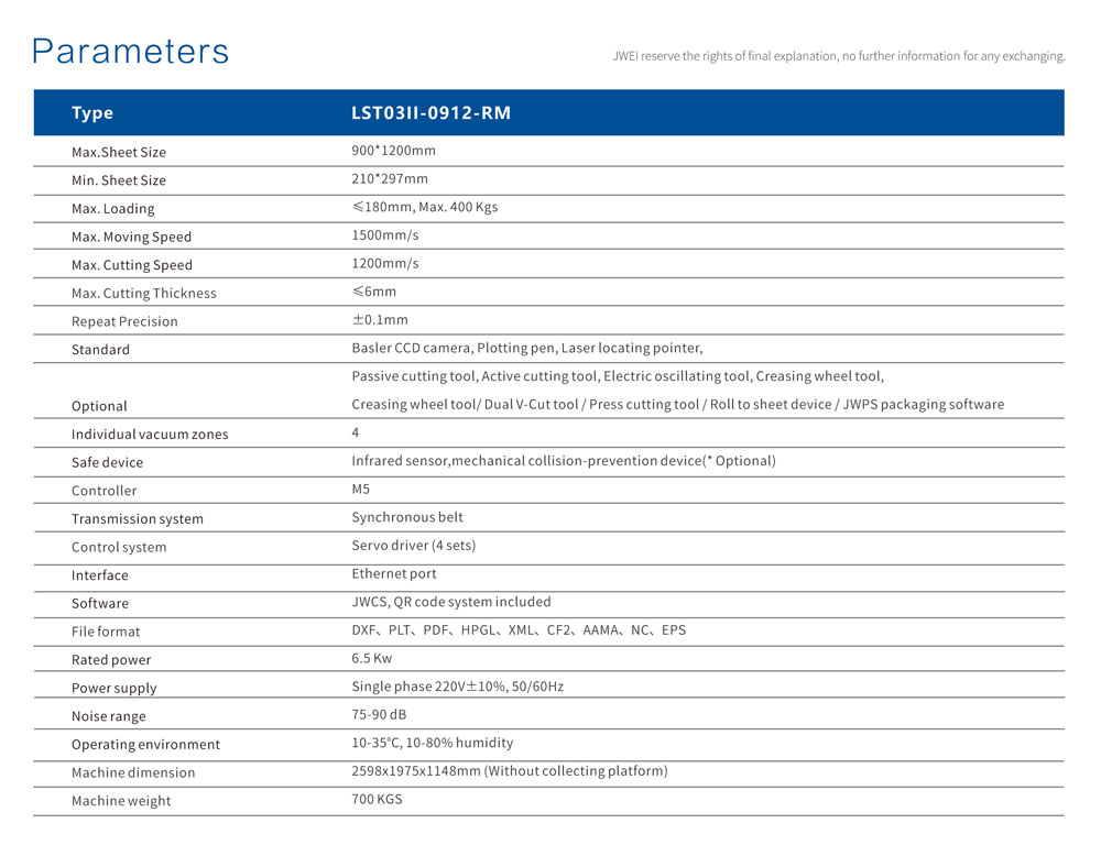 Design originale 1° al mondo, integrato con utensile da taglio, rotella di cordonatura, penna per tracciatura e sistema di registrazione CCD, serie JWEI LST03 taglia digitalmente etichette di qualsiasi forma, scatoloni pieghevoli di qualsiasi struttura direttamente dai tuoi disegni originali. Progettata per la produzione on-demand a basse tirature, la serie LST03 è altamente automatizzata dalla funzione di riconoscimento del codice QR per il recupero automatico del file di taglio. Solo 15-70 secondi per finire un foglio A3-B2 (dipende dalla complessità delle forme).